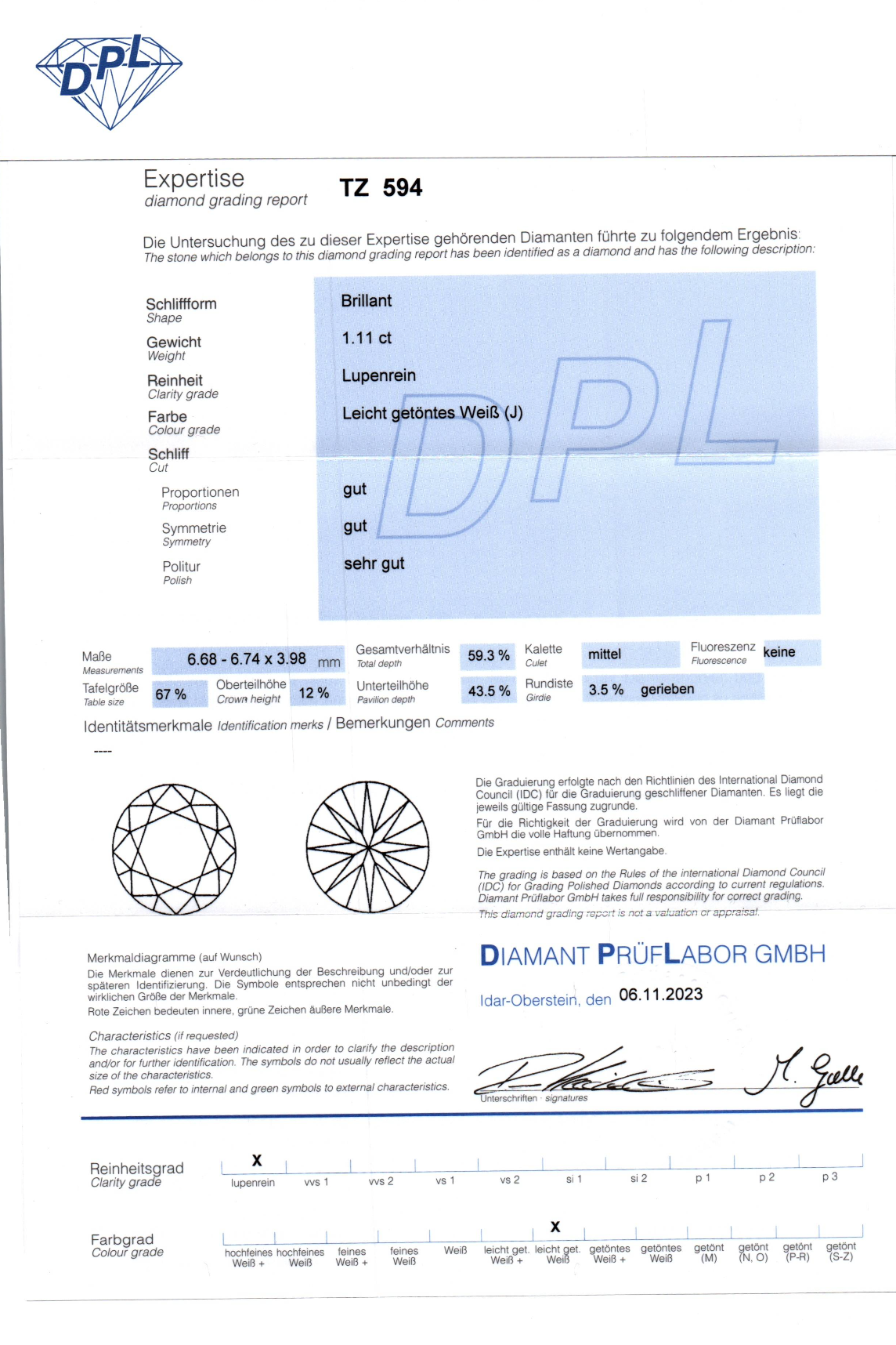 This extraordinary solitaire ring combines stylish elegance with masterful craftsmanship. At its center sits a flawless 1.11 carat brilliant-cut diamond, set in a delicate six-prong setting that allows the stone to shine with maximum brilliance. The slightly tinted color (J) emphasizes the warm character of the stone, while its precise cut ensures impressive brilliance – confirmed by the DPL certificate.