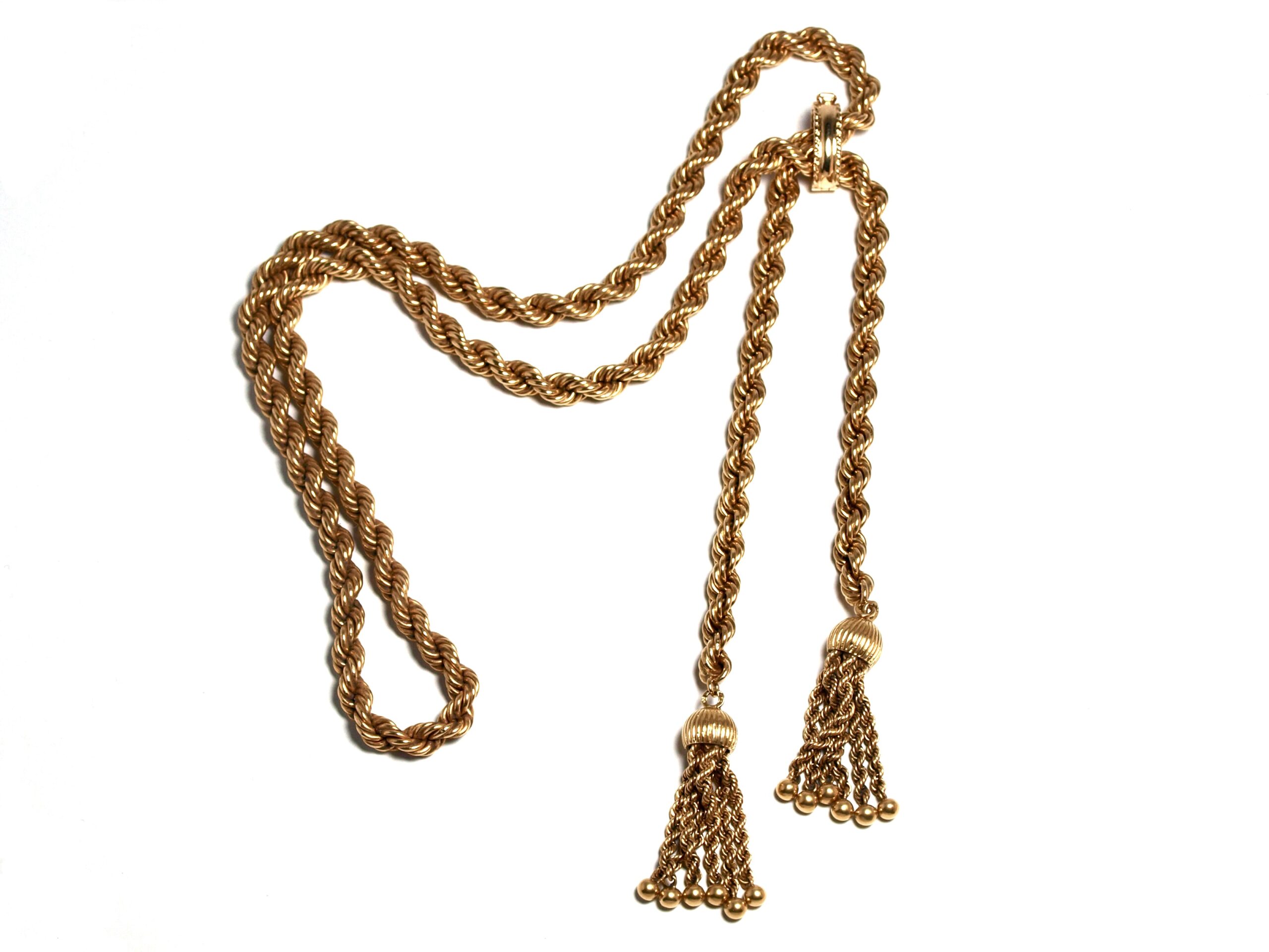 Rope necklaces with tassels ramk among the most iconic jewelry forms of the 20th century. Comparable pieces were worn by style icons such as the Duchess of Windsor, who was known to have favored and worn similar deliberately restrained gold necklaces with tassels. They embody a confident, modern concept of luxury that asserts itself less through gemstones than through material quality, weight, and formal language.